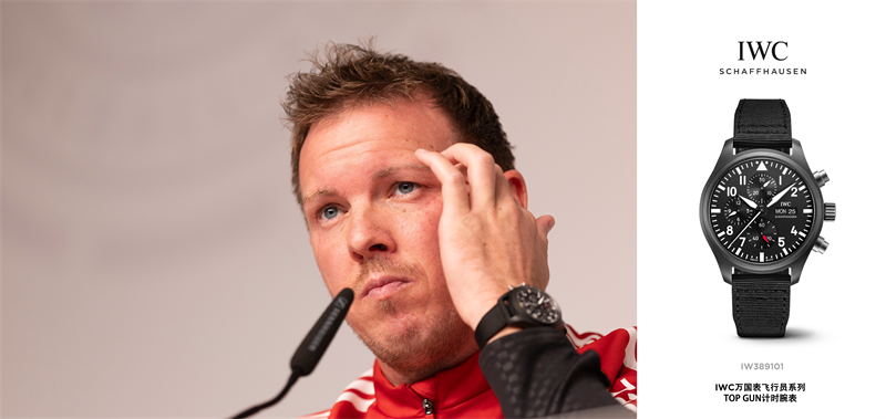 德国队主教练尤利安·纳格尔斯曼 (Julian Nagelsmann) 在欧洲区预选赛中率队连获两场胜利:11月14日,在卢森堡体育场举行的赛事中,德国队对阵卢森堡队顺利取胜;11月17日,于德国莱比锡红牛竞技场迎战斯洛伐克队,球队再度取胜并成功锁定2026年美加墨世界杯参赛席位。两场比赛期间,纳格尔斯曼均佩戴IWC万国表飞行员系列 TOP GUN 计时腕表(型号:IW389101),该腕表配备 44.5 毫米陶瓷表壳与黑色表盘,尽显专业风范。