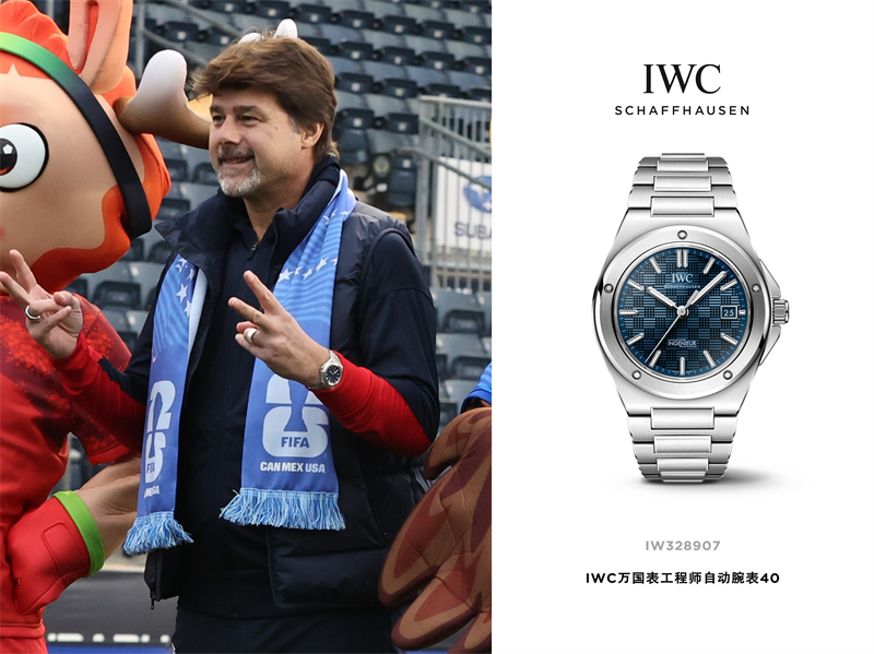 11月15日,美国队与巴拉圭队在宾夕法尼亚州切斯特市的斯巴鲁公园球场举行国际友谊赛。赛前,美国队主教练毛里西奥·波切蒂诺 (Mauricio Pochettino) 佩戴了IWC万国表工程师自动腕表40(型号:IW328907)与FIFA官方吉祥物合影留念,该腕表配备40毫米不锈钢表壳与蓝色表盘。