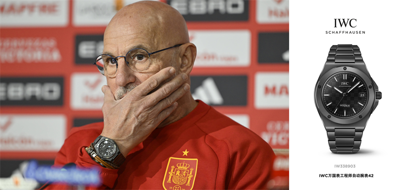 11月18日,在西班牙塞维利亚拉卡图哈体育场举行的预选赛中,西班牙队与土耳其队战平,主教练路易斯·德拉富恩特 (Luis de la Fuente) 率队成功锁定世界杯直接晋级资格。与此同时,西班牙队以 31 场正式比赛不败的战绩,追平该项世界纪录。路易斯·德拉富恩特当天佩戴了IWC万国表工程师自动腕表42(型号:IW338903),腕表配备42毫米陶瓷表壳与黑色表盘。