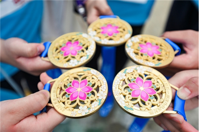 值得一提的是,此次赛事的完赛奖牌以紫薇花为形、以金马河、江安河为脉,杏花点缀其间,底纹是乡村林盘的抽象画,将温江的花木意象与奋进姿态巧妙融合,备受跑者们喜爱。