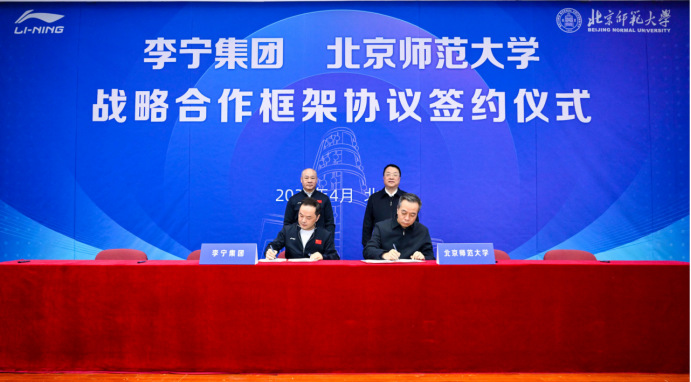 4 月 9 日,李宁集团与北京师范大学正式签署战略合作框架协议,携手开启校企协同发展新篇章。北京师范大学党委书记程建平,李宁集团董事长李宁出席活动现场,共同见证签约时刻。签约仪式由北京师范大学党委常委、常务副校长王守军主持,北京师范大学党委常委、副校长康震,李宁集团副总裁、首席运营官金翟宣,李宁集团副总裁、首席人力资源官宋春涛等代表双方签署战略合作框架协议及系列专项协议。签约仪式后,双方就合作内容的落实与前景展望进行了座谈交流。