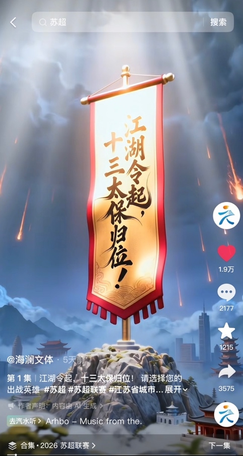赛场之上热血沸腾,赛场之外热度不减。“海澜文体”此前在抖音发布的《江湖令起,十三太保归位》短视频,在比赛结束后再次迎来转发高峰,点赞量突破1.9万,视频中“苏超”战火重燃的热血场面,与首轮比赛中十三市球队的精彩表现完美呼应,进一步点燃了江苏人的足球热情。而作为“苏超”官方战略合作伙伴,海澜之家更是精准捕捉赛事热点,快速响应、下场玩梗,成为球迷心中“最懂苏超”的品牌。