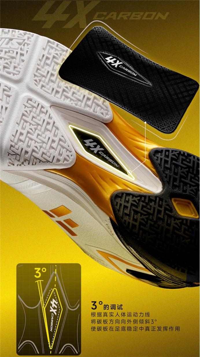 作为逆闪最具标志性的科技亮点,欧击创新性地使用了四轴碳布中底稳定模块。这个被命名为“四轴碳基脊甲”的创新科技,采用龟背状碳板,能够根据脚步行进轨迹调整碳板方向,显著提升移动变向时足弓区域的抗扭转与支撑能力,适配羽毛球运动变向、蹬跨、急停等全动作场景,为足底筑起全方位的稳定防线。