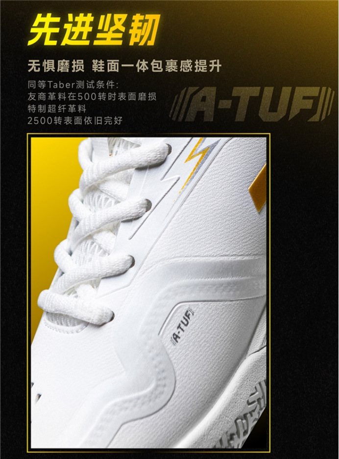 除此之外,逆闪羽毛球鞋在细节设计上也全面适配专业竞技需求:后跟外甲保护结构可紧锁脚踝,提升落地稳定性;一体内靴设计优化鞋身一体性,升级包裹体验;竹节鞋带具备高摩擦力特性,可有效避免运动中松脱;趾跟处的引导弯折设计,减少蹬地时的鞋内压迫感;宽体大底设计采用大面积上翻与外扩,为横向移动提供充足的侧向支撑与保护。